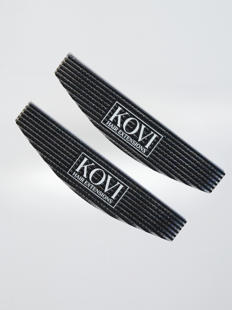 The KOVI Curved Velcro Grippers are designed to fit the round curve of the head to neatly secure stray hairs with ease during styling, cutting, or hair extension installs. With their unique curved shape, these grippers offer a comfortable, firm grip, making sectioning easier without the hassle of bulky velcro. They provide a gentle, no-slip hold for all hair types, ensuring no damage during use.